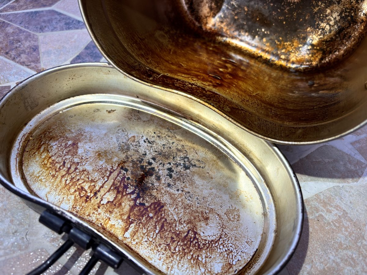 写真のようにアンバー色の燻製エキスが飯盒に付着するので、洗ったとしても直後に炊飯すれば燻飯っぽい風味にはなってしまいます。