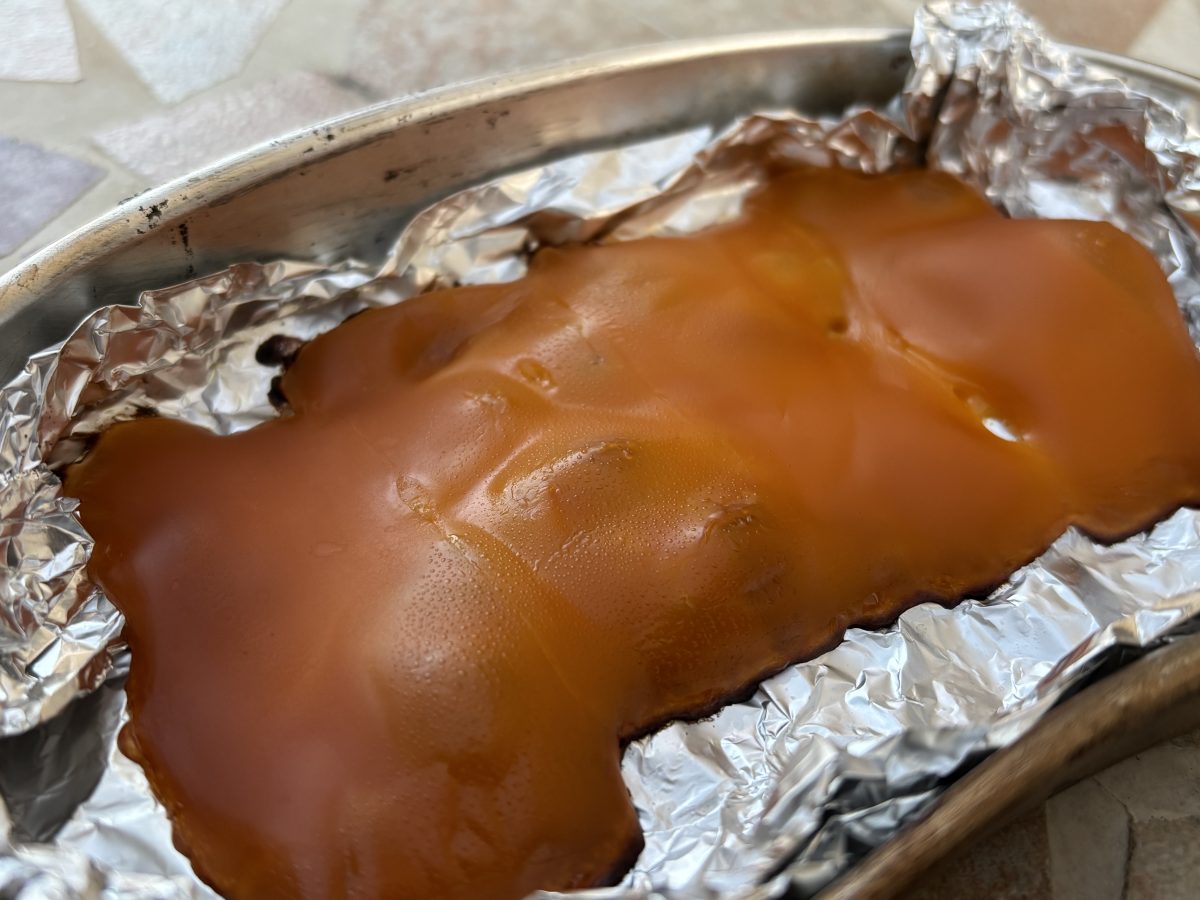 燻したては赤茶色ですが、冷めて落ち着けば黒っぽい感じの見慣れた燻製になります。これはまた味が違うのですが、それを食べられるのも自分でやるからこそ。