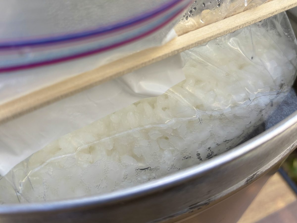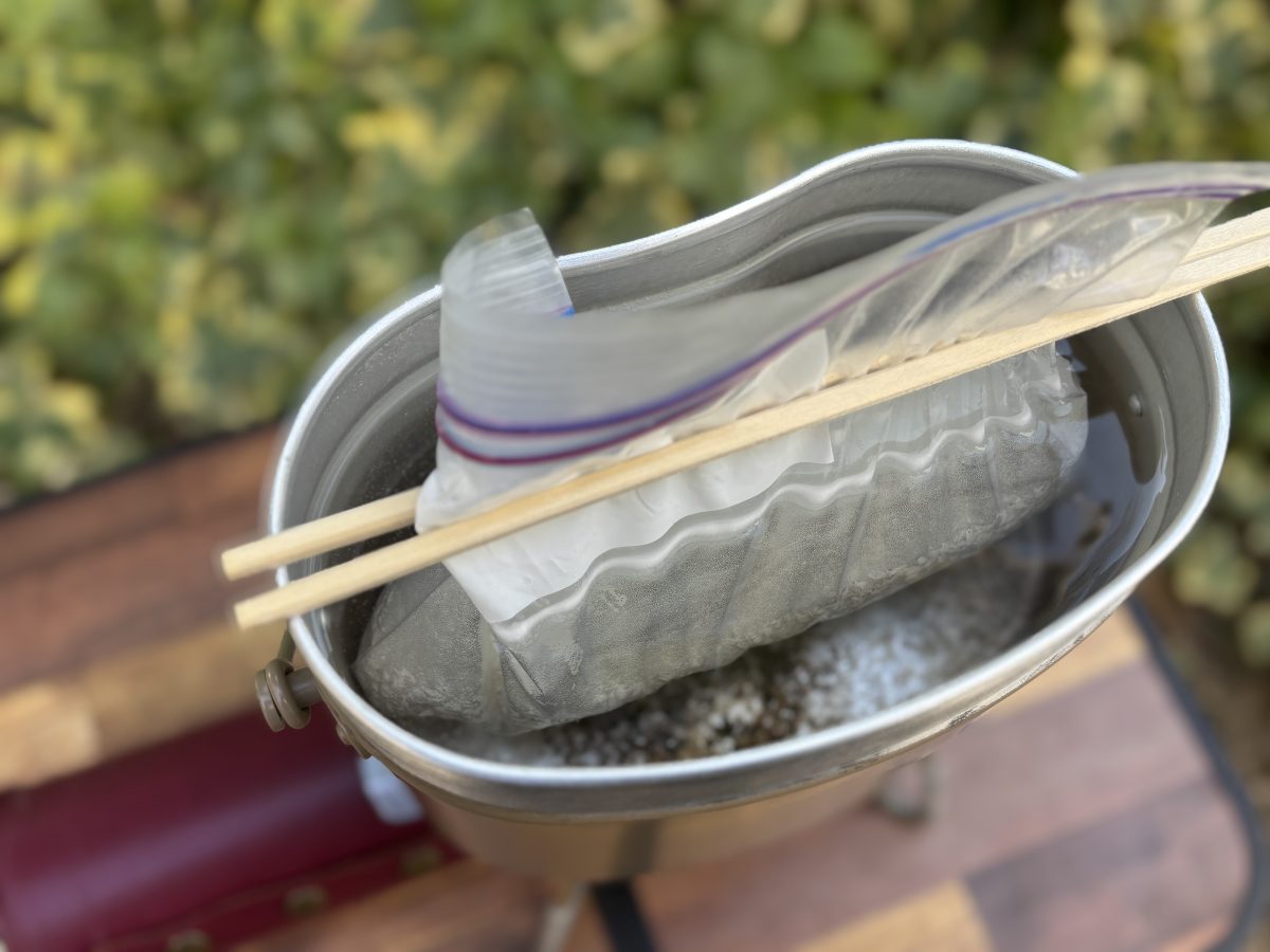 そして「鍋底に袋が接触しないように気をつける」ことも重要です。そのまま加熱し続けると袋が破ける可能性があるため、目を離さないか、袋を吊るすようにしておくかで解決。