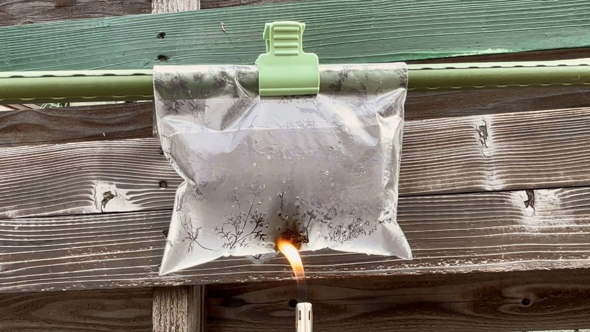 写真の通り、水の入った袋に直接火を当てても、そう簡単には穴は空きません。これで加熱して調理を進めることも可能ですが、少々コツが必要で面倒。